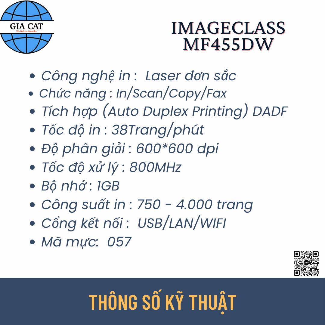 Vậy điều gì khiến Canon MF455dw trở thành lựa chọn lý tưởng? Gia Cát JSC đã “giải mã” các thông số kỹ thuật để bạn dễ dàng nắm bắt: